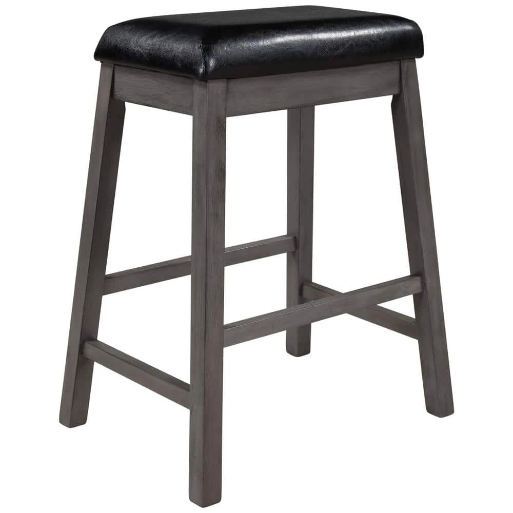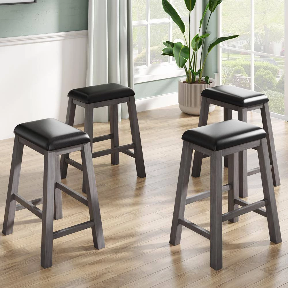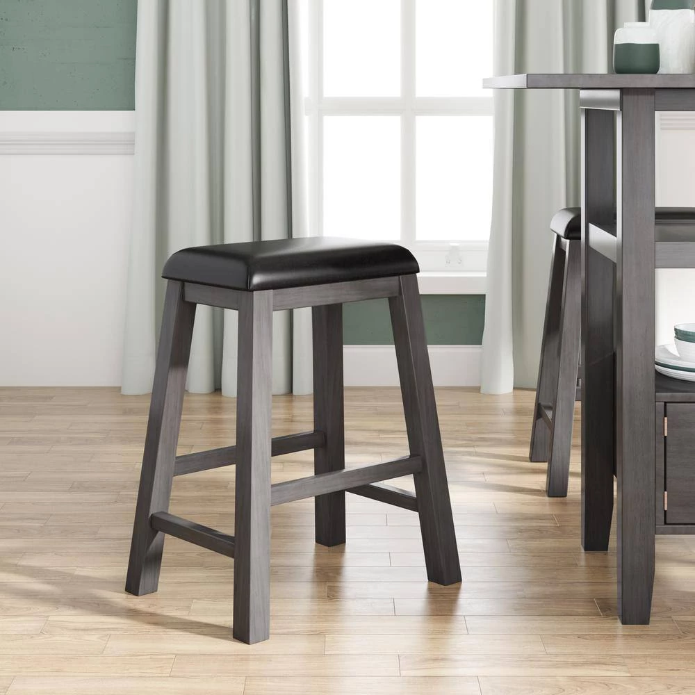with a classic wooden framework, this dining stool features eye-catching contrast available in either gray or brown finishes. The farmhouse design combined with the natural wood grain on the stool legs creates a timeless look that will add a charming atmosphere to any dining space. Simple assembly required, all hardware and instructions included in the boxes.