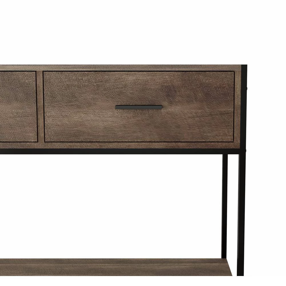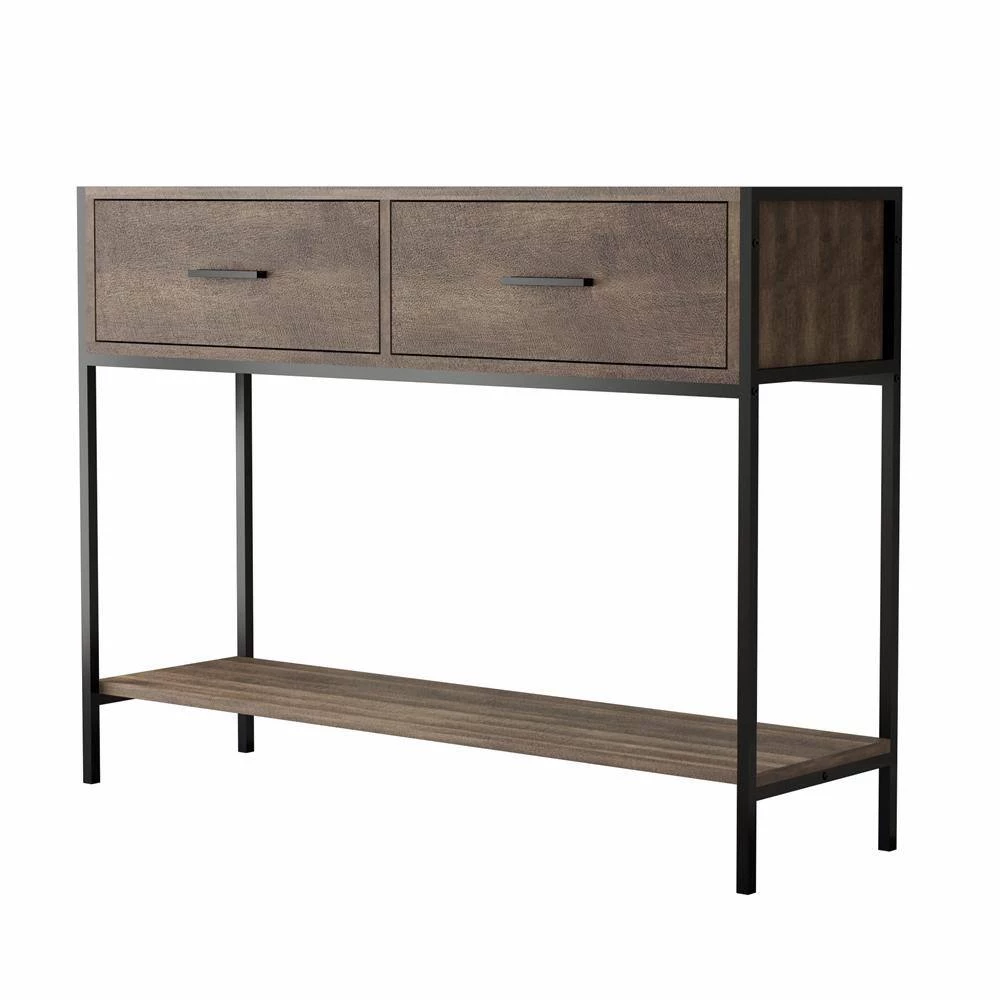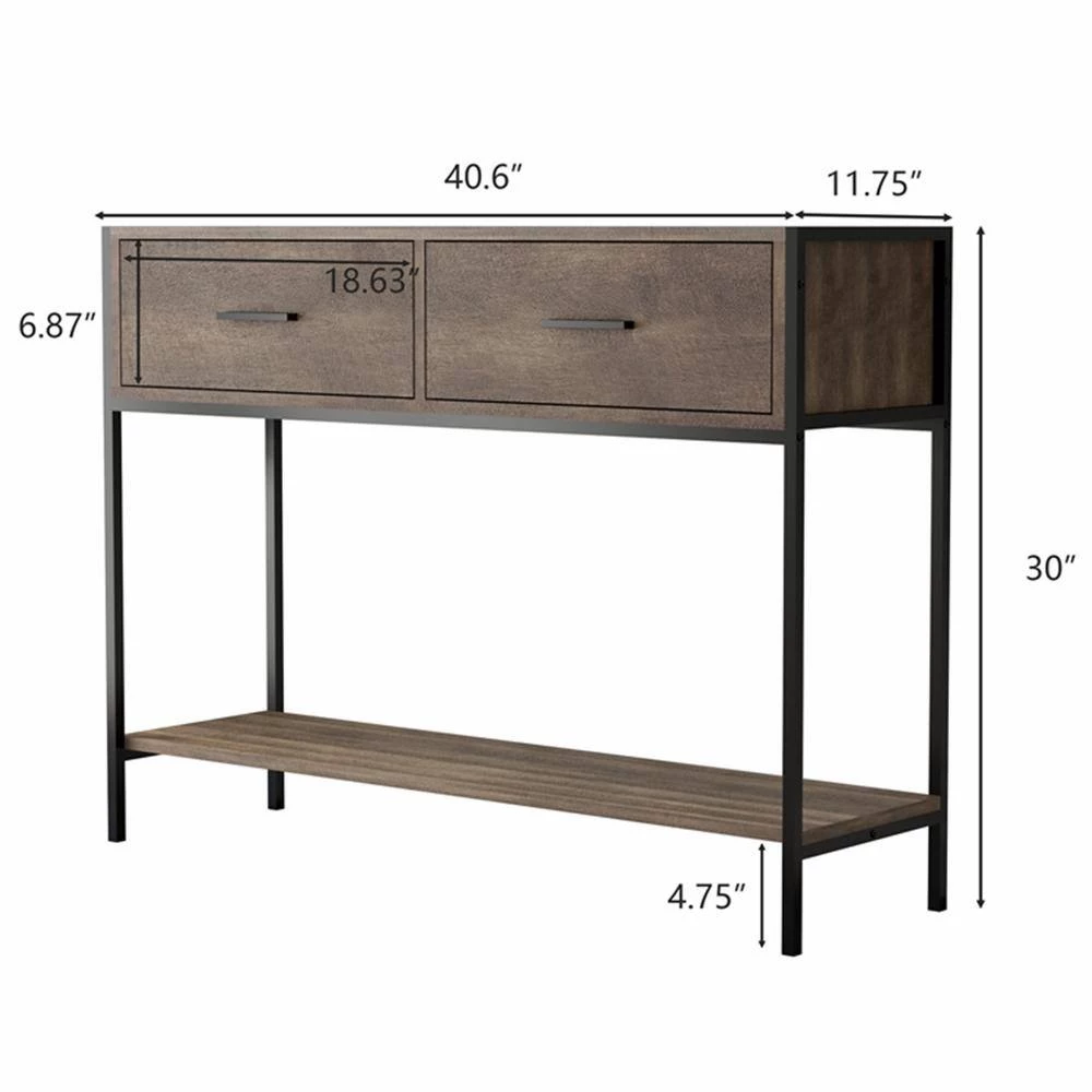 With this console table, it is all in the details. this rustic entryway table is designed with minimalist style. along with a stable structure to make a unique statement, which provides powerful practicality rather than a household adornment. With plenty of space to offer, utilize the two front facing storage drawers to minimize clutter while keeping select essentials within easy reach, or display your favorite decor.on the spacious upper counter or bottom shelf. Able to fit with ease in apartments or compact spaces, this table makes an impact in your home as an elegant statement piece without leaving a large footprint. Conserve valuable space in your home by positioning the table against a wall with the solid frame being light enough for easy relocation.