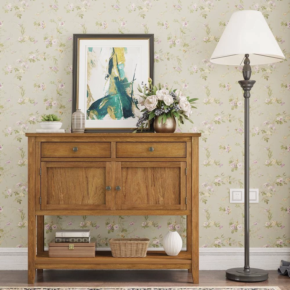 - With built in shelving ranging from front double doors to 2 drawers, users will have plenty of space to store their belongings and avoid letting clutter accumulate on console table