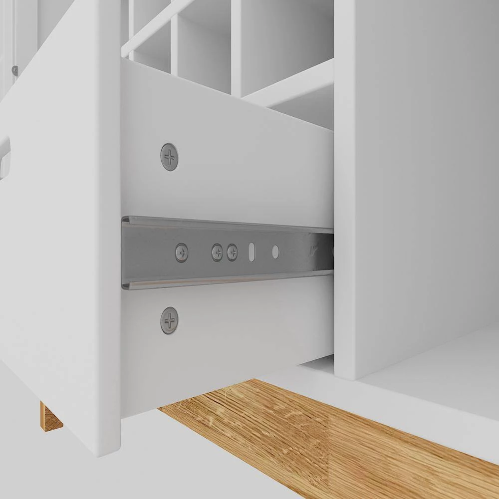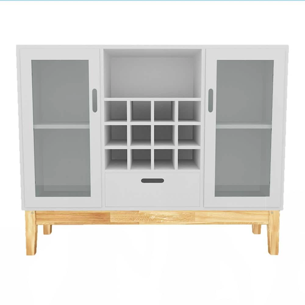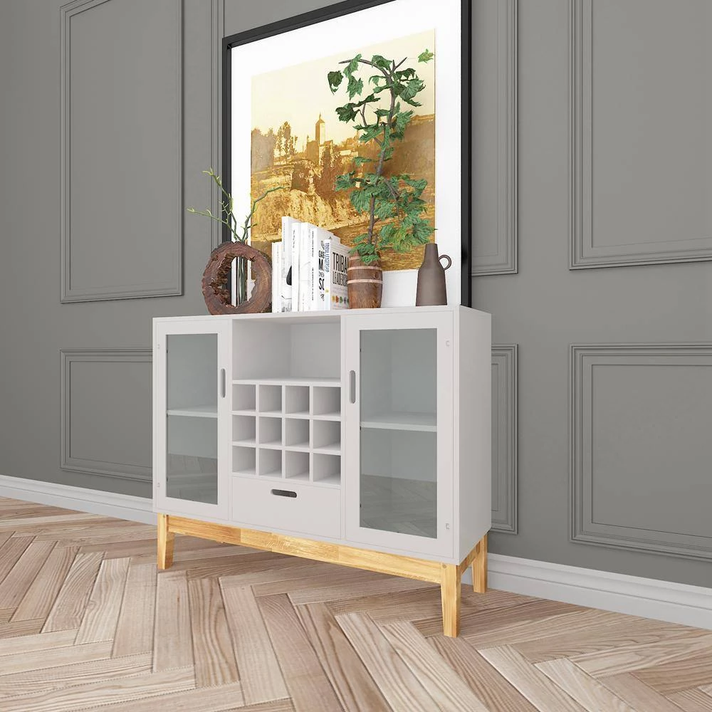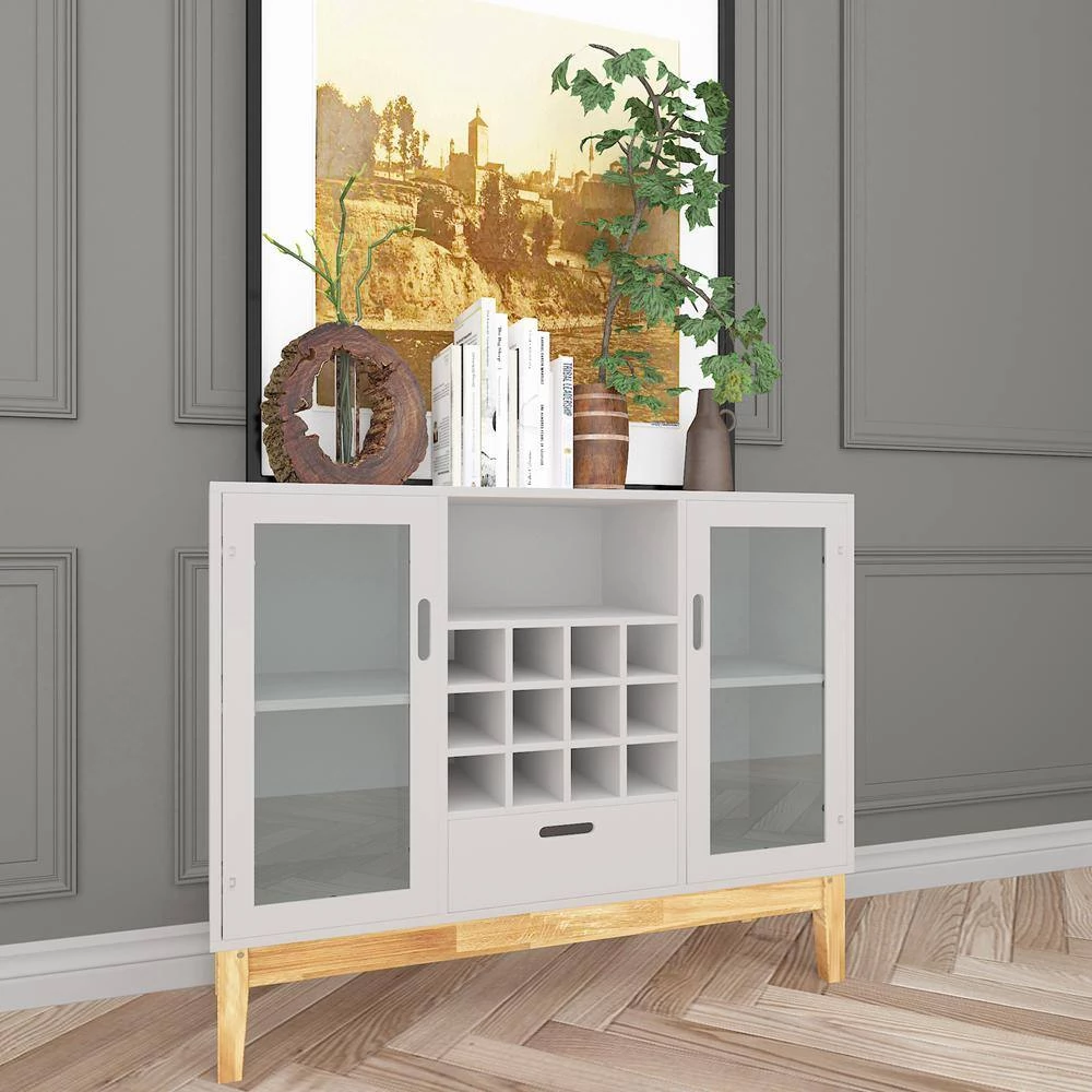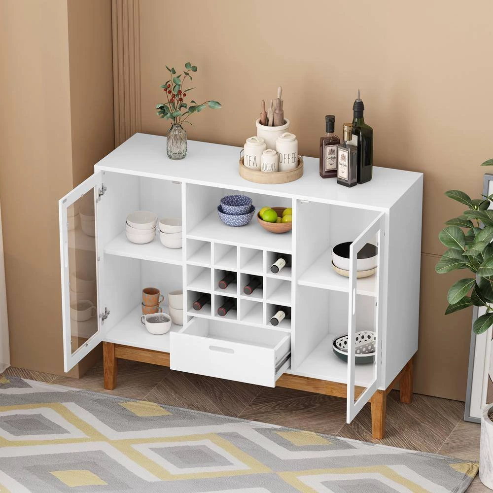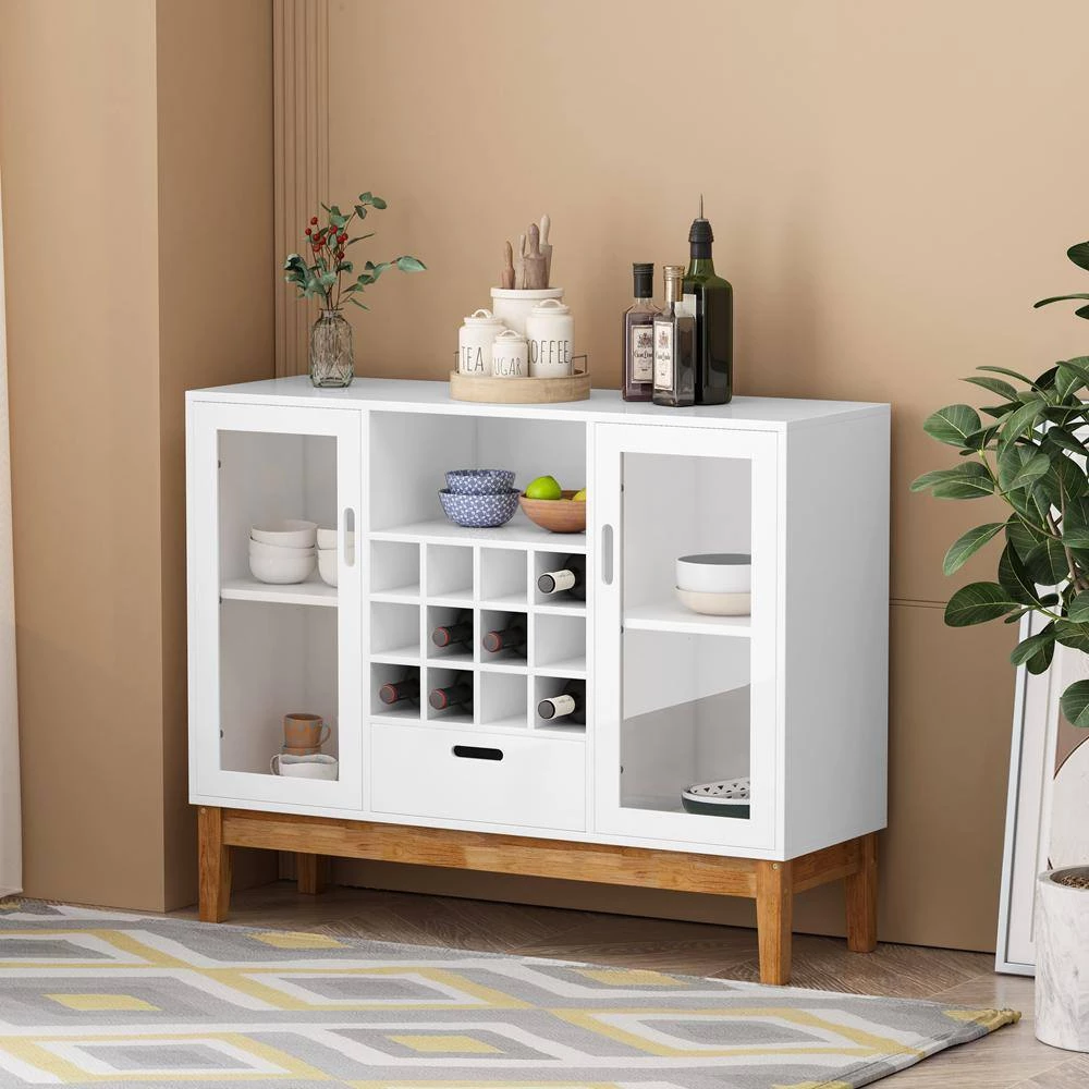 A spacious countertop, an open shelf, a utility drawer, 2-concealed cabinets, and a 12-grid wine rack provide ample space for your wine collection and utensils. Modern stylish appearance in muted colorway is suitable for most home furnishings.Modern appearance: On-trend style to display your decorations and bottles beautifully. The muted colorway and is suitable for most decorations.