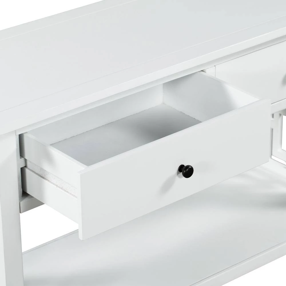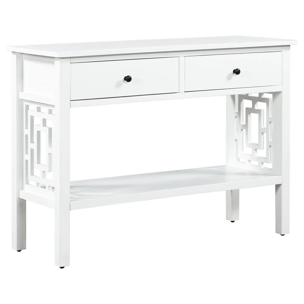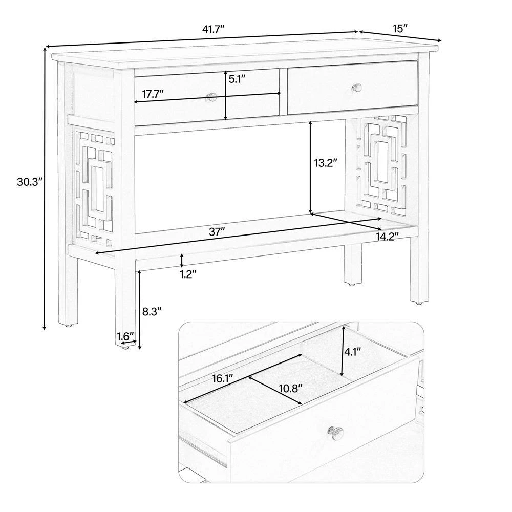 - Our console table is functionally designed, meet diversifying storage demands. There are two drawers at the top to provide sufficient storage space for your files, daily necessities, sundries and keep organized, one shelf under the drawer, which can support dictionaries, books, or pot culture, etc. Top board can place your favorite photos, vase, decorations, lamps or other knickknacks.