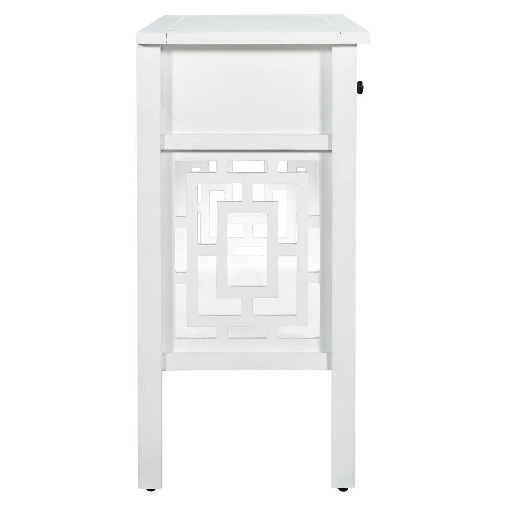 This side table is definitely the perfect choice for your home. The artistic retro design on both sides makes your side table extraordinarily beautiful and brings out the unique vision and taste of the owner of the house. Crafted with sturdy legs, this console table comes complete with two top drawers that open to hold your daily necessities and keeping them out of sight.Two-drawer and One open shelf allow for plenty of storage space for displaying framed photos, magazines, and other belongings.