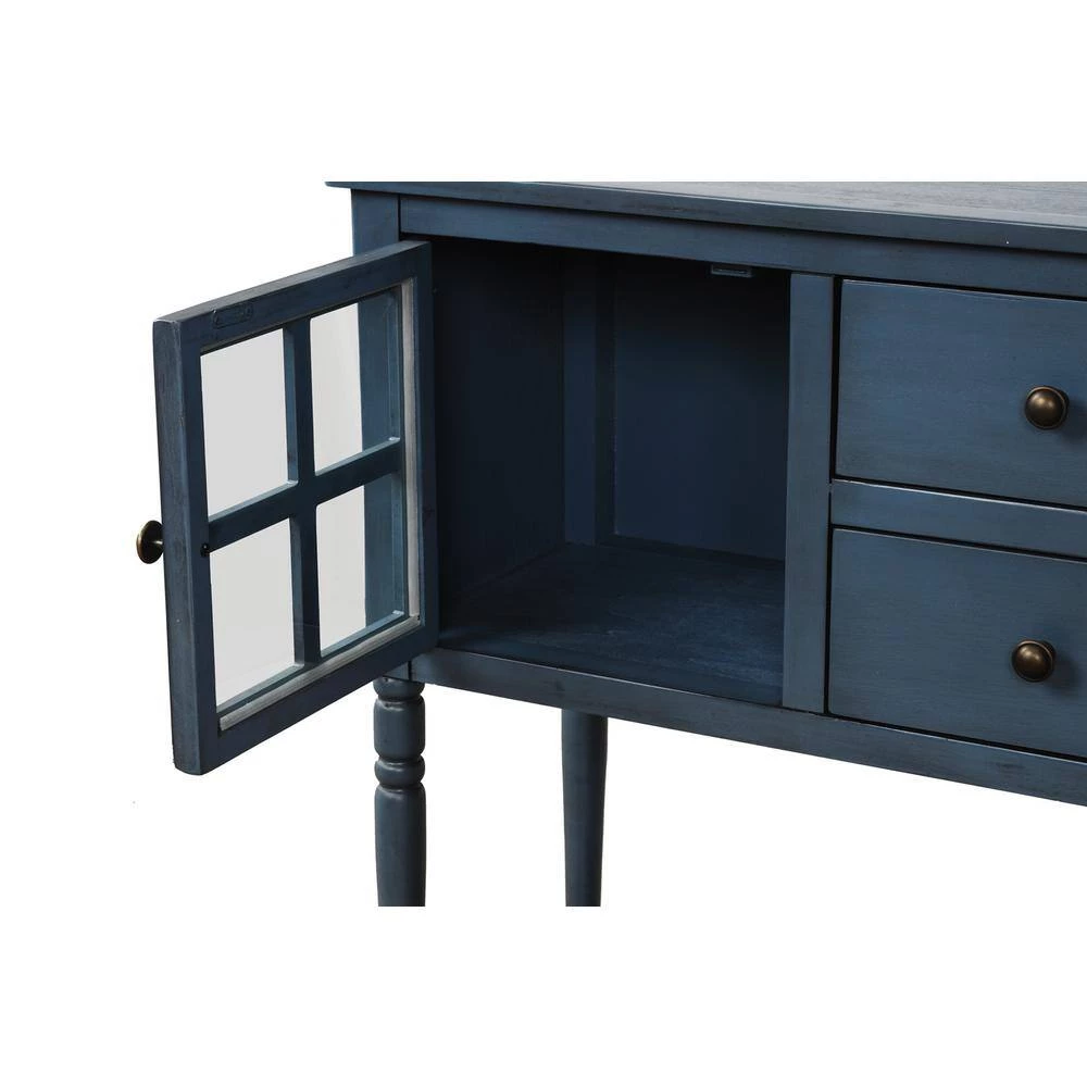 Featuring spacious open table top and bottom shelf, two glass-front cabinets and 2-drawers, this sideboard provide you enough storage space for your favorite decorations or books or for storing necessities and tableware. Exquisite appearance design. the sleek corners of the bottom plate and distinctive solid wood Roman legs create a distressed retro style. Sophisticated brass knobs add culture and elegance to this transitional console table. This piece of home.furniture is design. To be a multi-functional space saver which is suitable for dining room. entrance or living room. Solid wood frames and legs and tempered glass make this cabinet stable and durable.