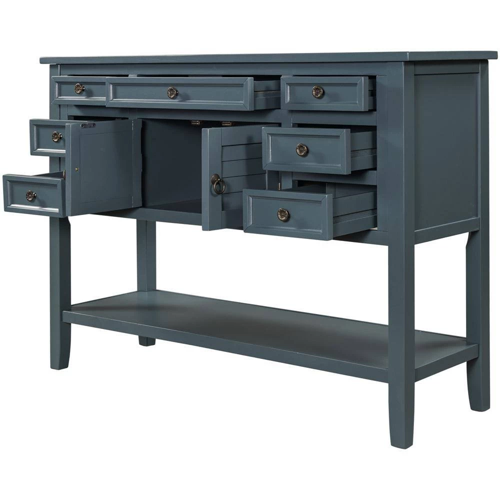 Effortlessly fill in that blank space in your home with this console table, designed to fit all of your needs and more. Crafted with a classic vintage appearance, this table comes complete with two front facing cabinet doors that open to reveal a spacious interior, perfect for stowing away your larger necessities and keeping them out of sight. The 6 matching compact side drawers and 1 middle drawer minimize clutter, offering plenty of space to hold smaller items such as keys or mail while the spacious bottom shelf is the perfect place for storage baskets, shoes and more. Crafted with thick Pine and MDF wood slabs and accented with quality iron handles, this piece is manufactured for quality and exudes a high-end appeal that will leave your guests talking.