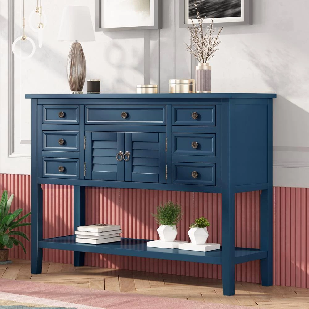 - With built in shelving ranging from the front double doors to the 7 accent drawers, users will have plenty of space to store their belongings and avoid letting clutter accumulate on the console table.