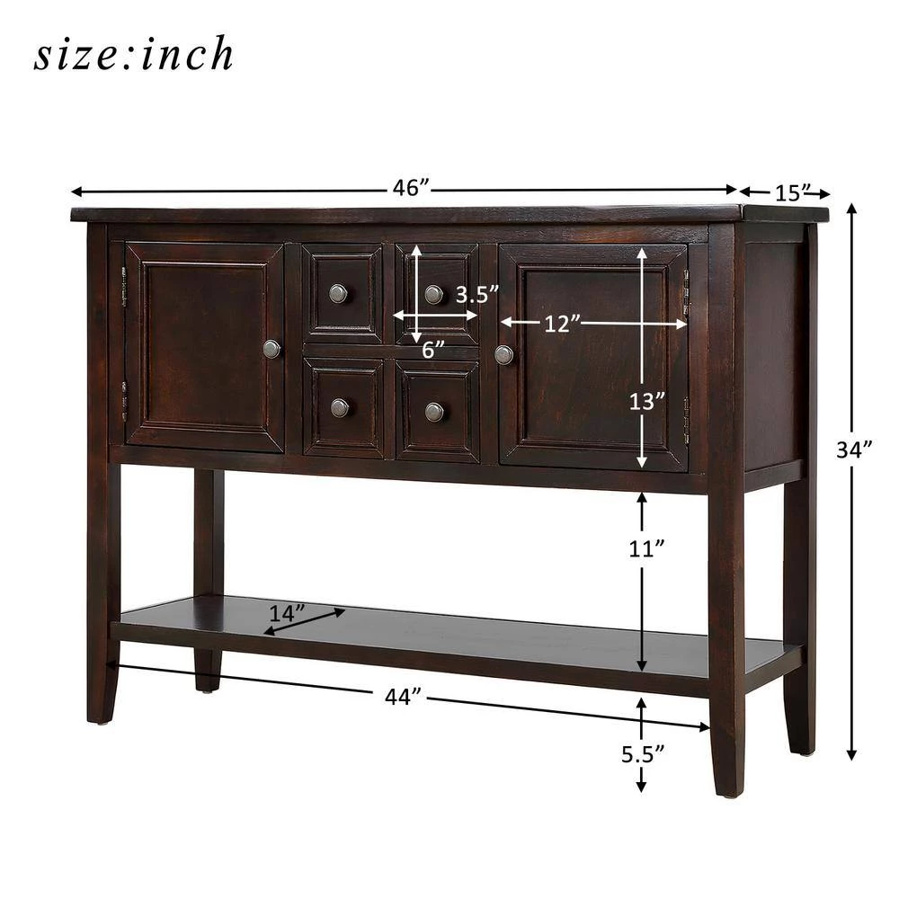 - Sideboard cabinet measurements: 46 in. L x 15 in. W x 34 in. H