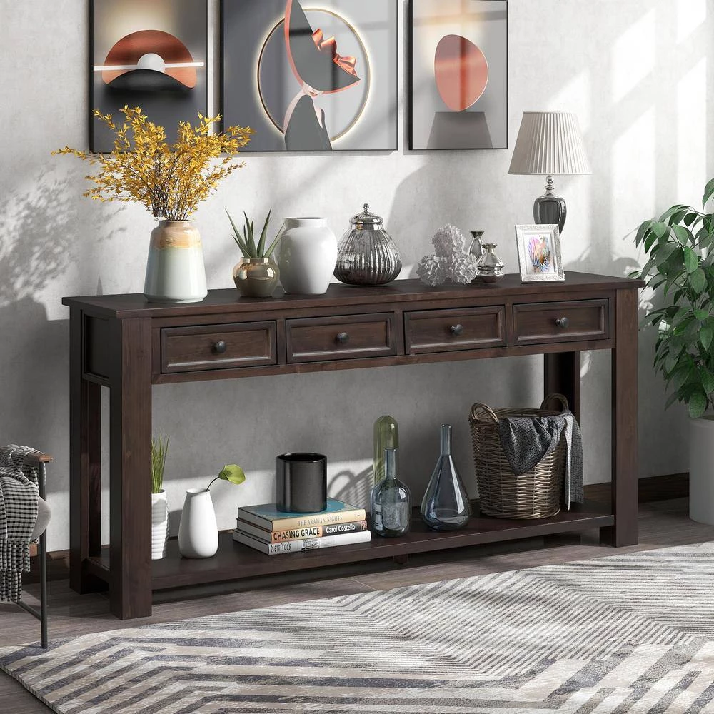 - Dimensions: 63 in. Lx 14 in. Wx 30 in. H console table features with 4-drawers and a fixed lower shelf and long enough tabletop which provide enough storage space