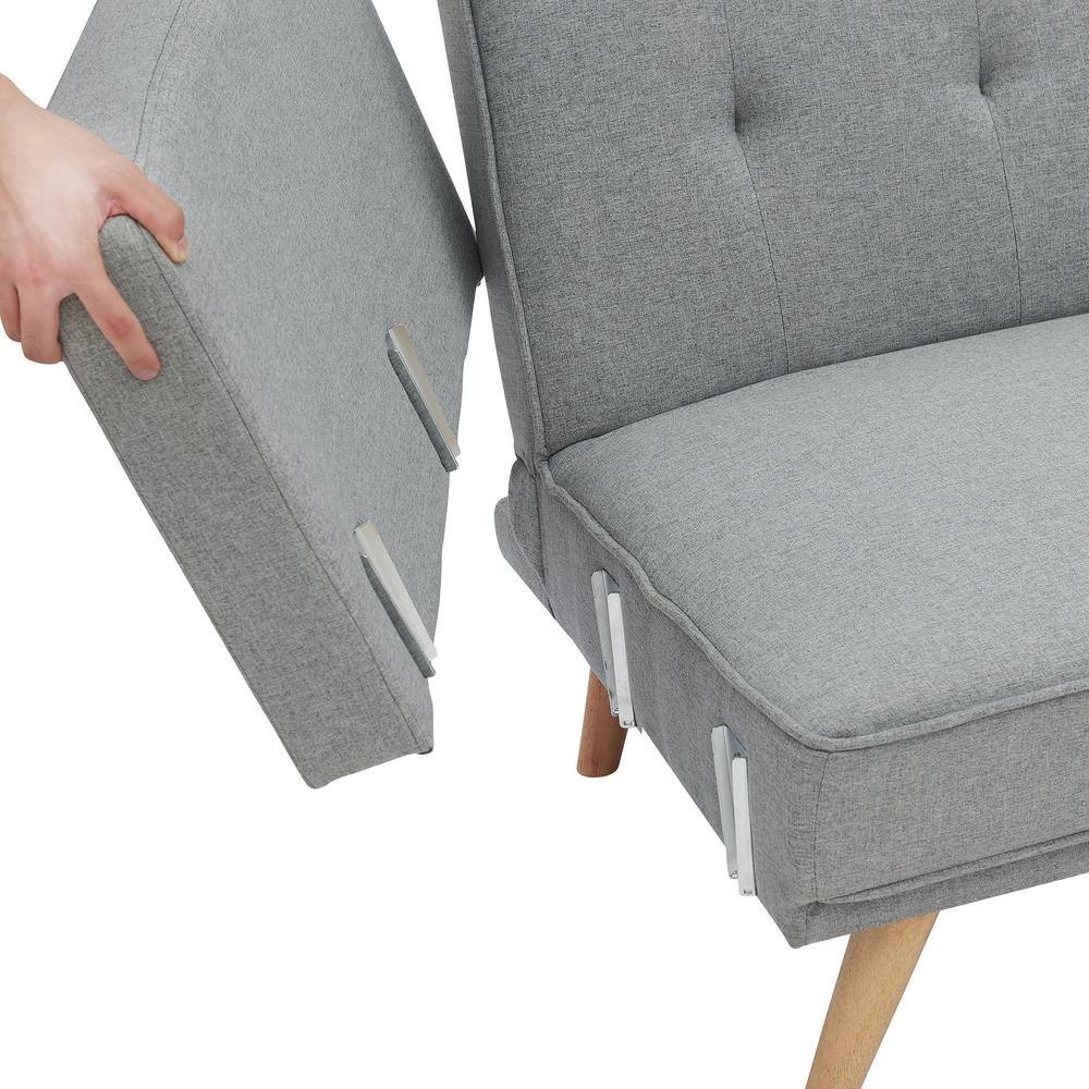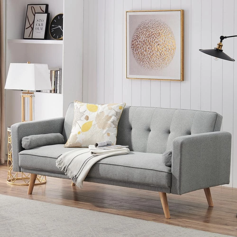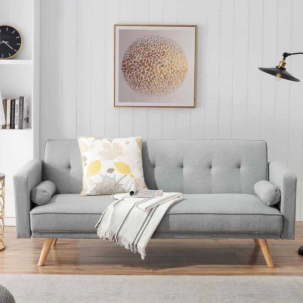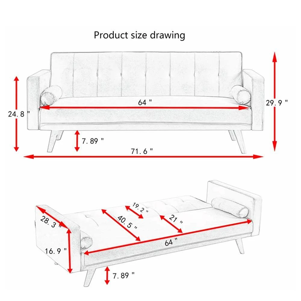 This sofa Tufting back decorates soft fabric for a hint of textural appeal. The split-back design seating can be independently lowered into a lounge or sleep position. This modern style sleeper sofa, while adding a spare sleep space when needed. Its designs with wood frame and square arms and tapered legs for a retro silhouette. The fabric upholstery is filled with foam. The striking thing about this sofa is that it can be converted into a bed to support as you sit or sleep.
