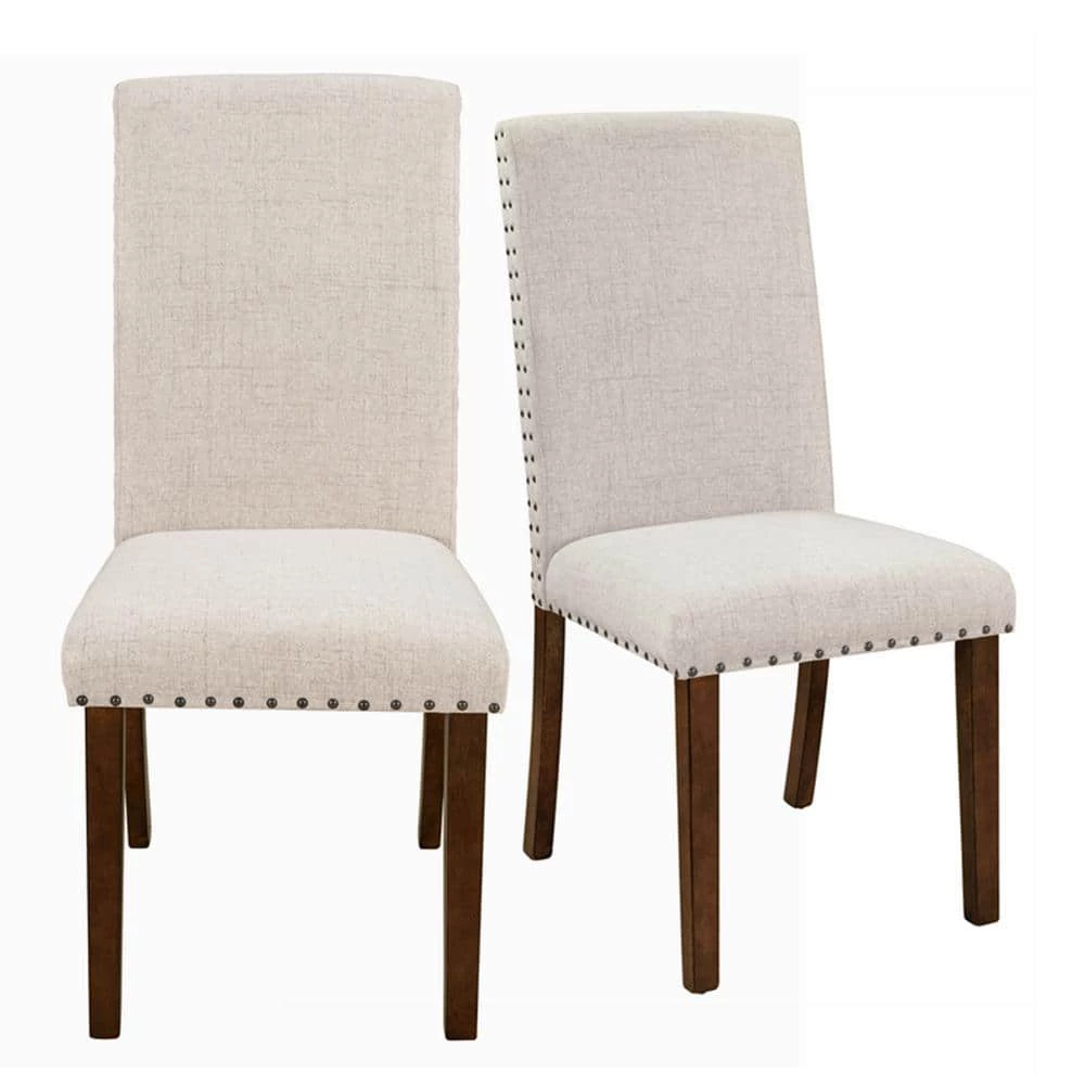 This Upholstered Side Chair Set gives your dining room a hint of rustic charm. Its comfy foam filled seats are upholstered in a charming linen and accented by a metal nail head trim. Smokey walnut finished legs featuring distress marks give this chair a slightly weathered look and a cozy feel.