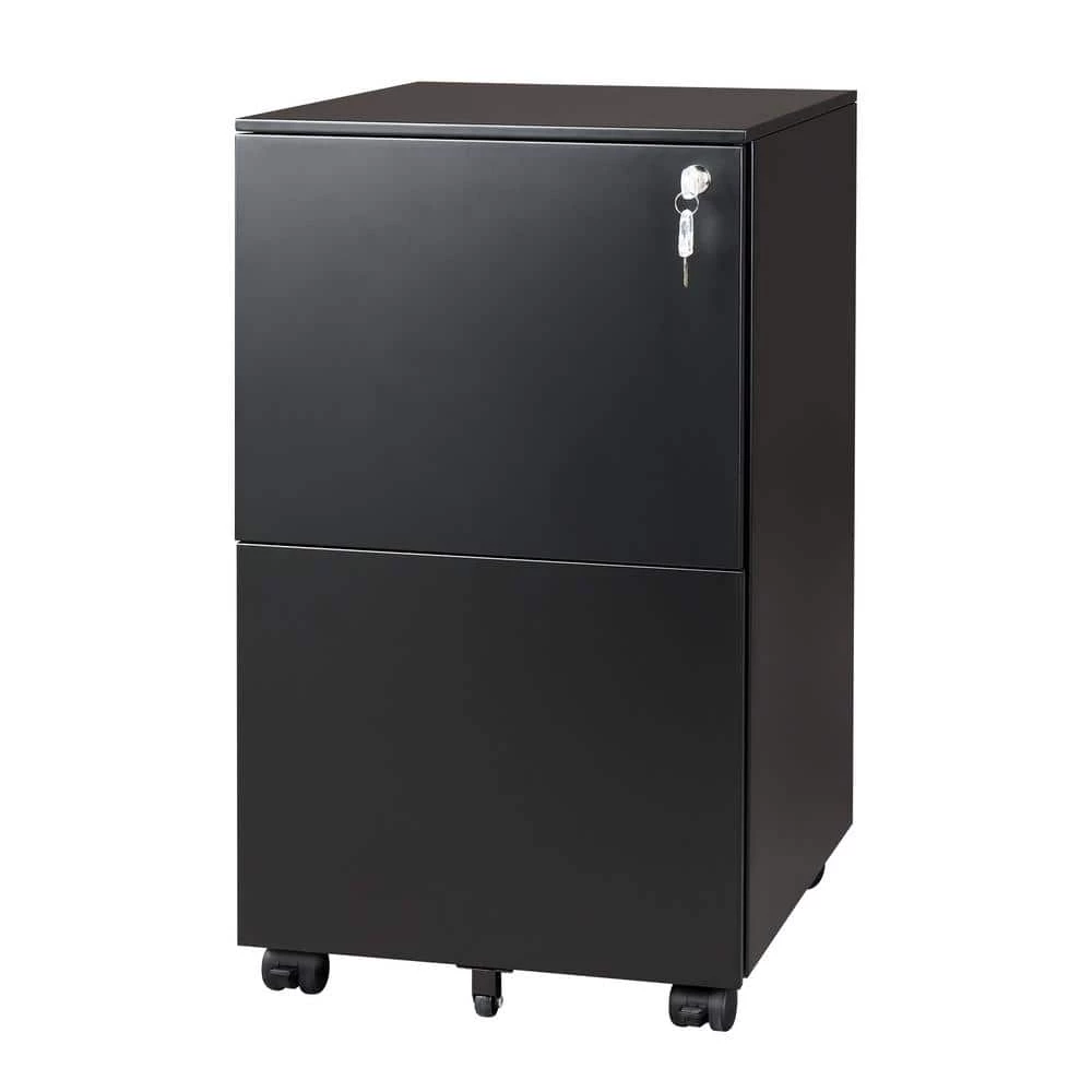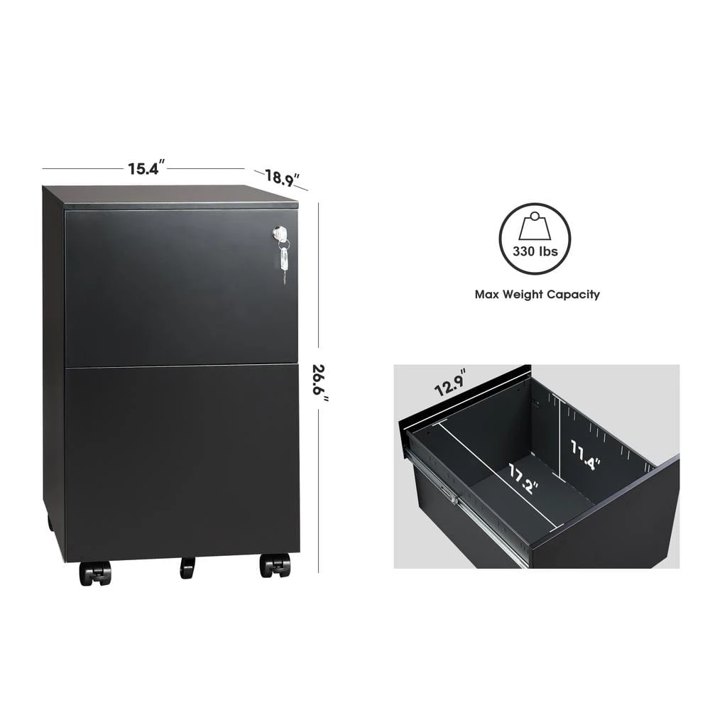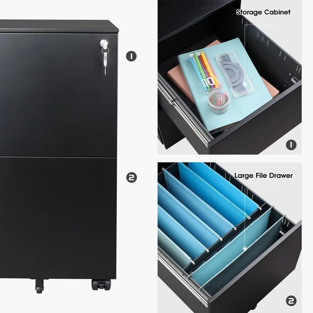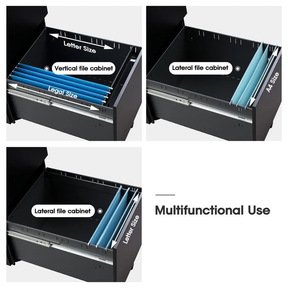 Simple but functional, this file cabinet is perfect to keep important documents secure. This Fully assembled metal cabinet fits under most desks, add security to your home or office. One lock secures both drawers, keeps your documents safe.2 high capacity file drawers with full extension slides, you can also decide on different combinations of hanging folders for each drawer (letter, legal and A4 size).