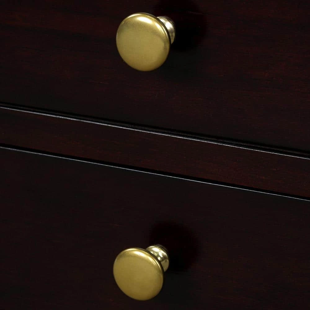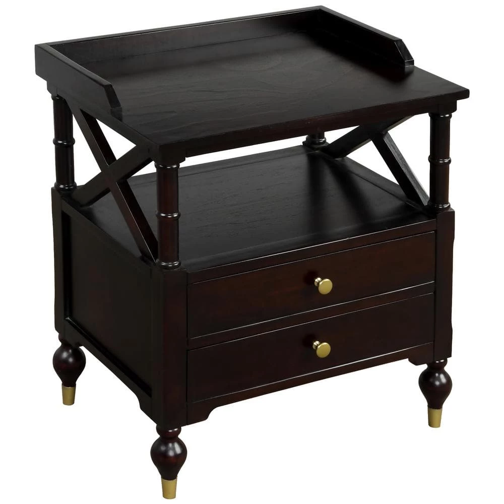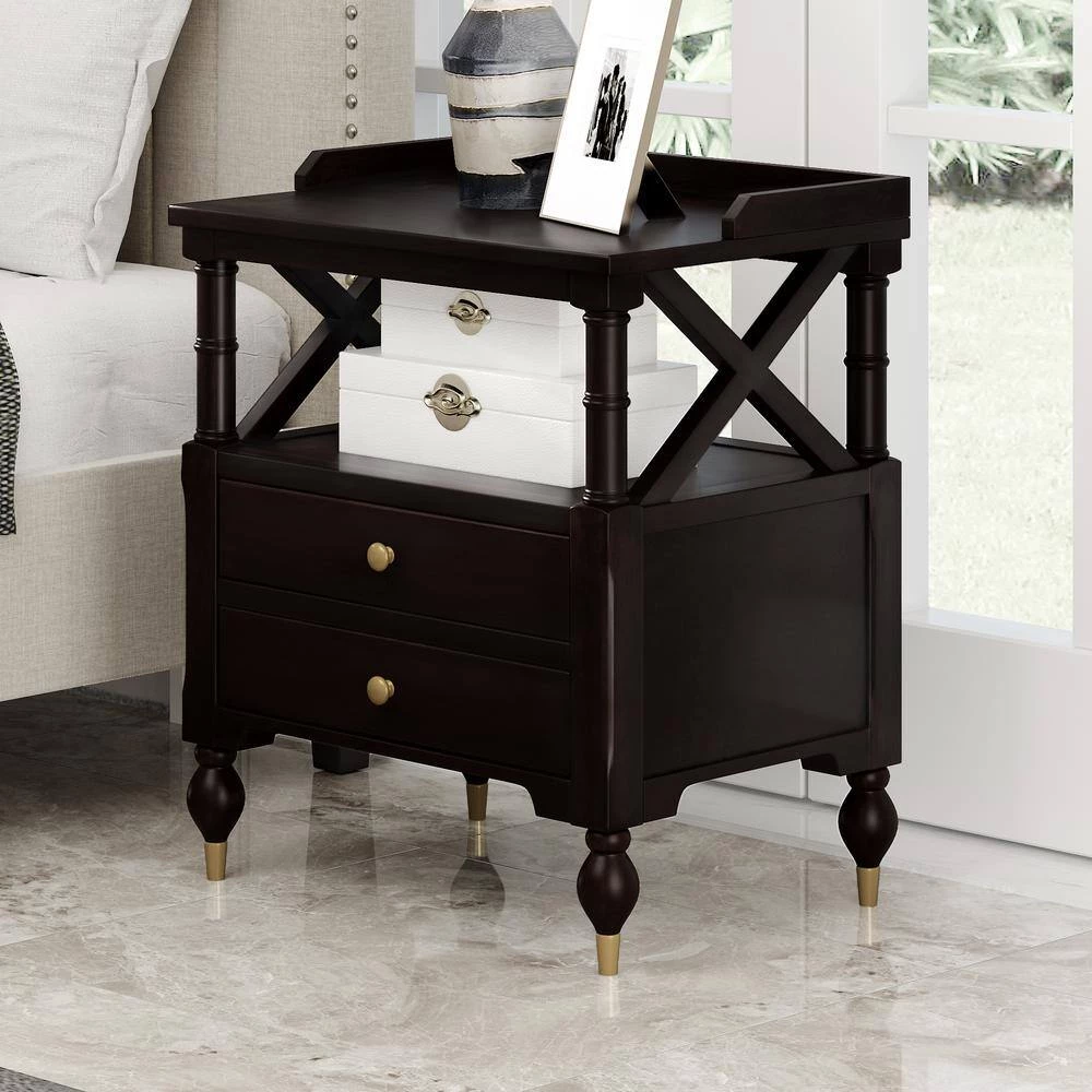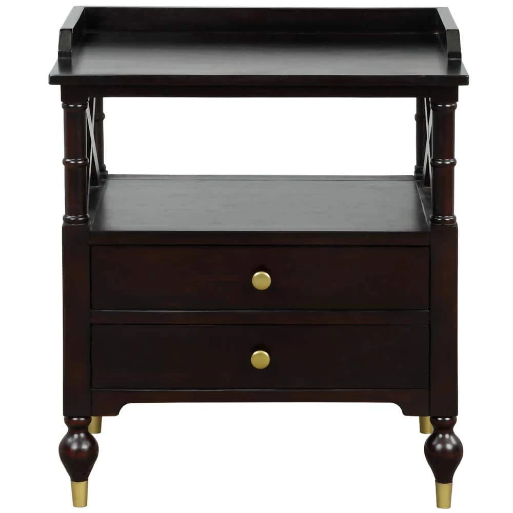 - Dark cherry finish of 2 drawer nightstand is offset by antique finished gold metal handles, giving nightstand a stylish look that will remain a sense for years