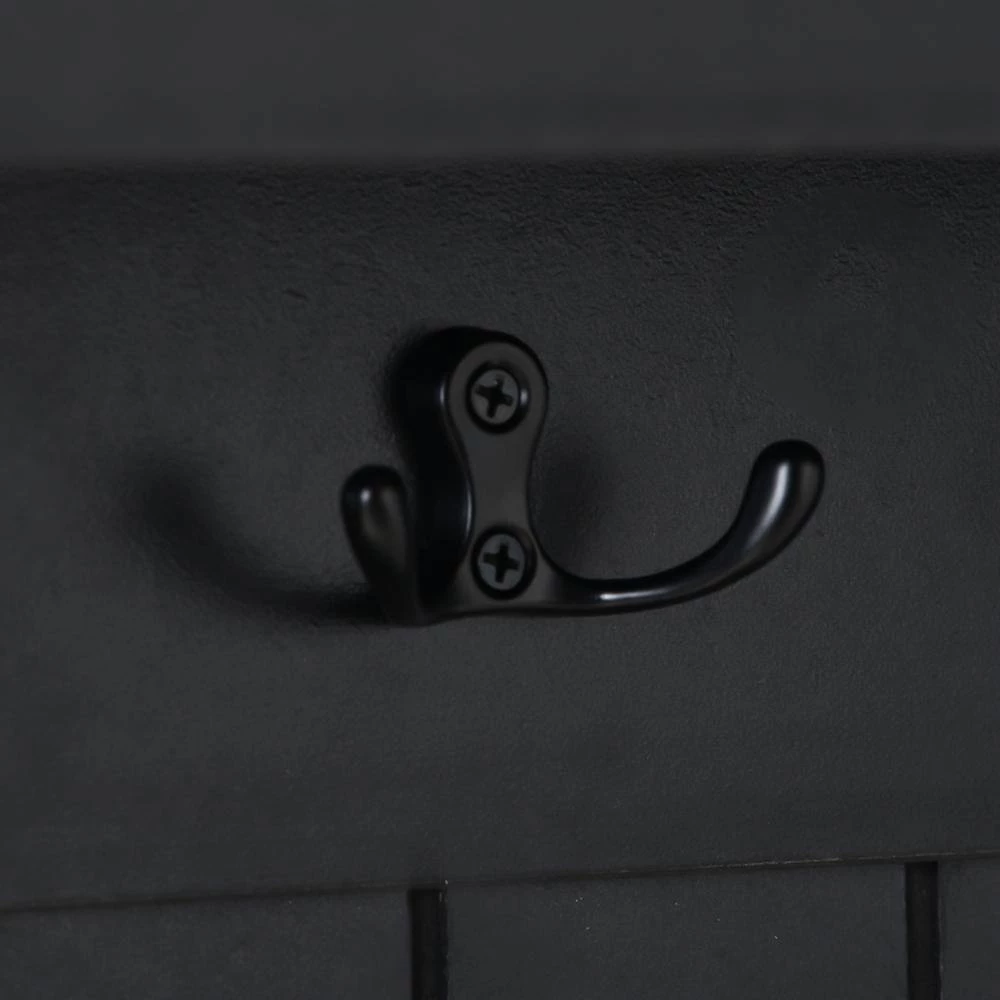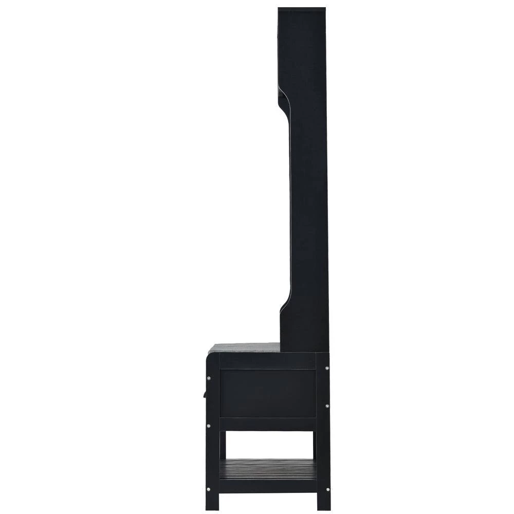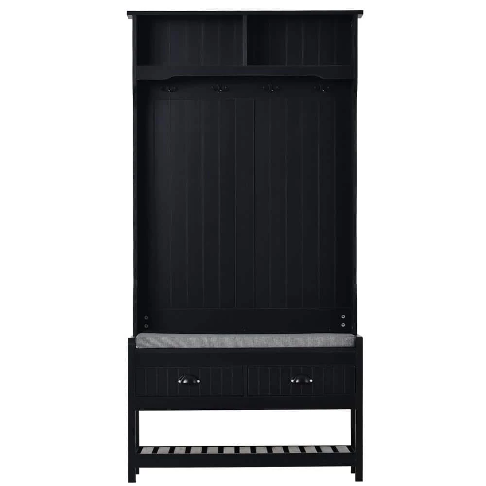 Are you still troubled by the messy clothes and shoes at the entrance,our 3-in-1 multifunctional hall tree can provide you with a good solution!Main Color Black. It consist of several parts:2 open shelves on the top for photo frames,potted plants and other decorations.4 double prong hooks for you to hang coats,scarves,hats and other accessories.