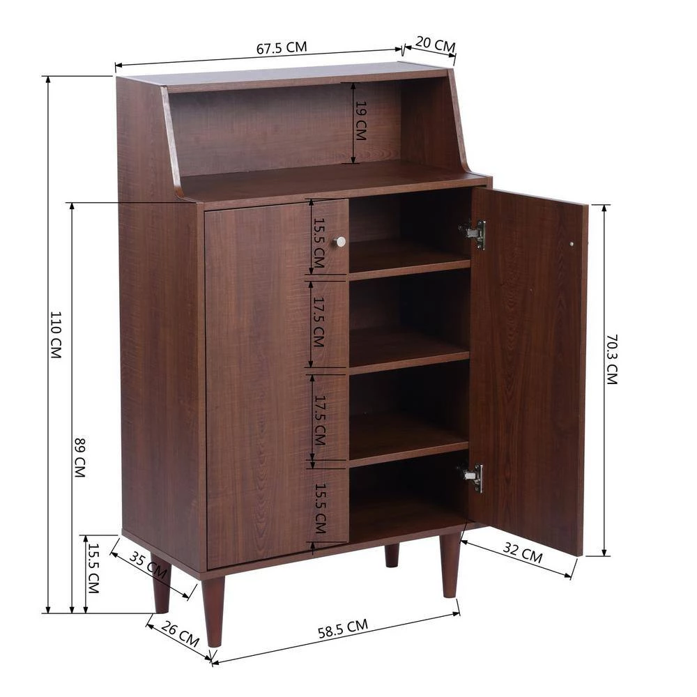 - Features storage space behind two (2) doors with FOUR shelves provide shoe storage for 8 pairs of shoes.
