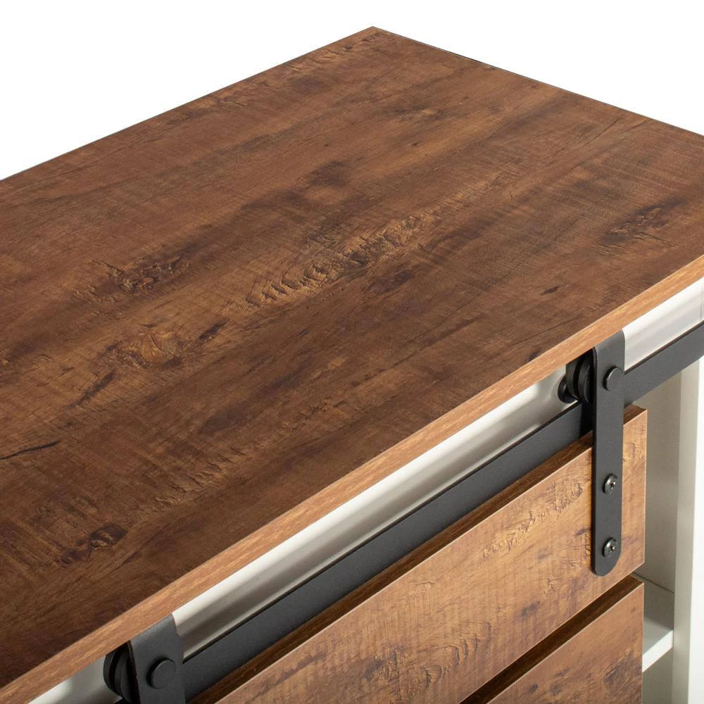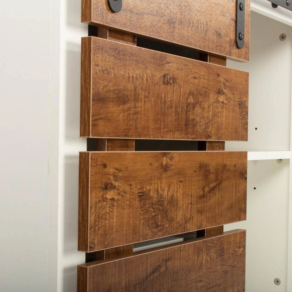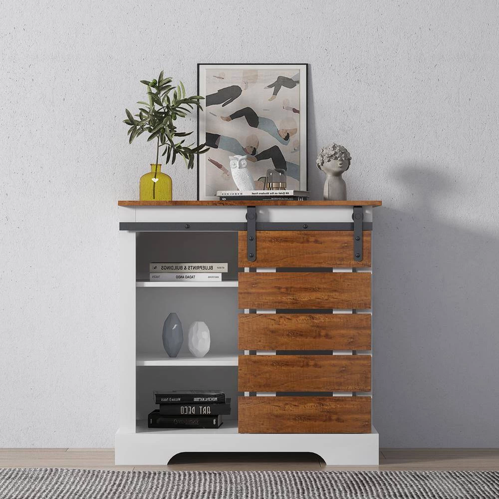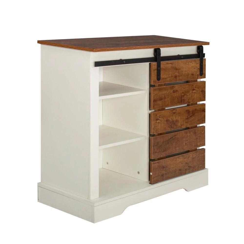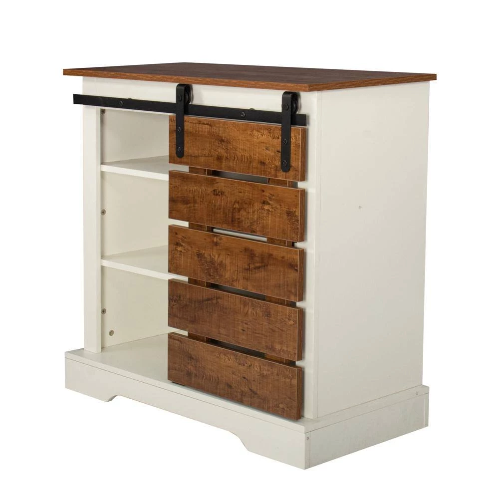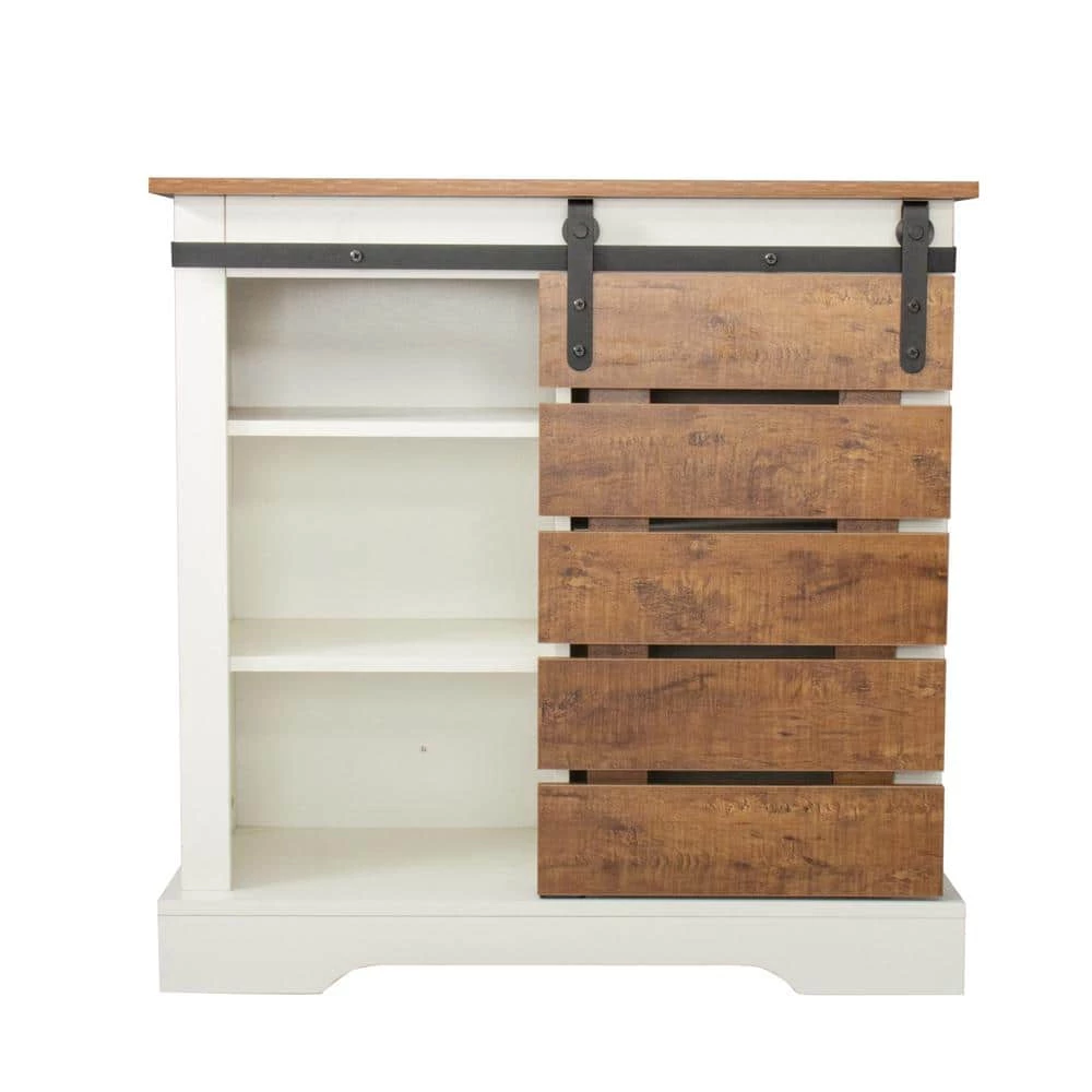 This modern farmhouse-inspired piece of furniture makes a distinct statement in any setting. The storage cabinet barn door style sliding door with retro hardware evokes a rustic charm in your home.This buffet cabinet features 5 storage shelves, providing compact storage for daily accessories, utensils, and plates.