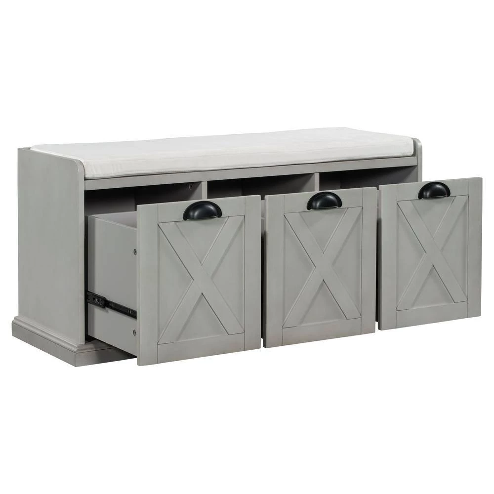 This functional bench has a rectangular, engineered wood frame that features 3-pullout drawers with barn door fronts and cup handles for a rustic touch. There are slide rails on both sides of the drawer for smoother use of the drawer. Each of the drawers meet the needs of multi-functional storage at home, and are ideal for storing books, shoes, umbrellas and other small items.Manufactured from pine wood frame with beautiful distressed finish, this bench is built to last and has solid stability that can withstand heavy weight with ease.