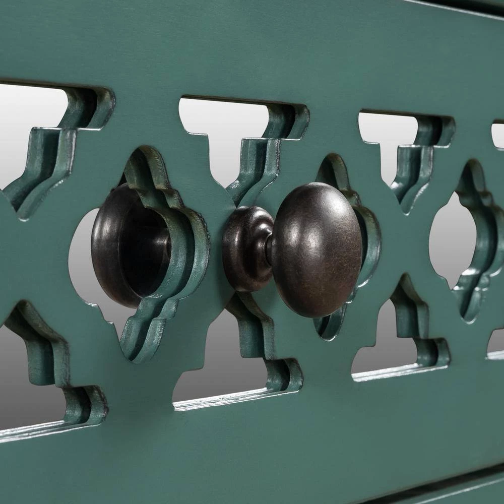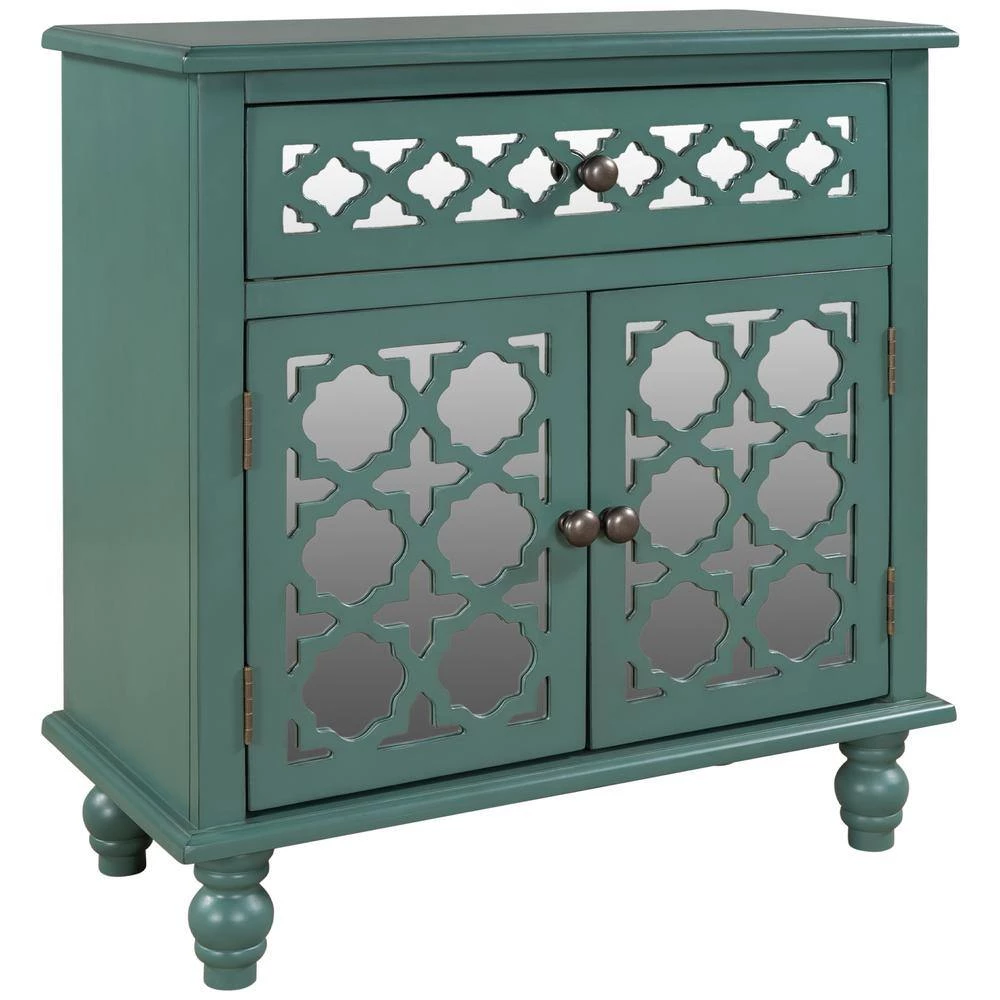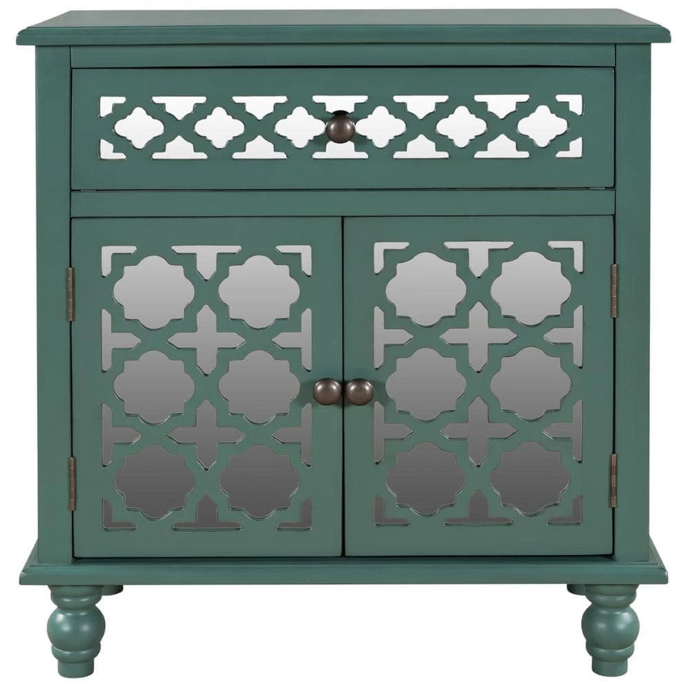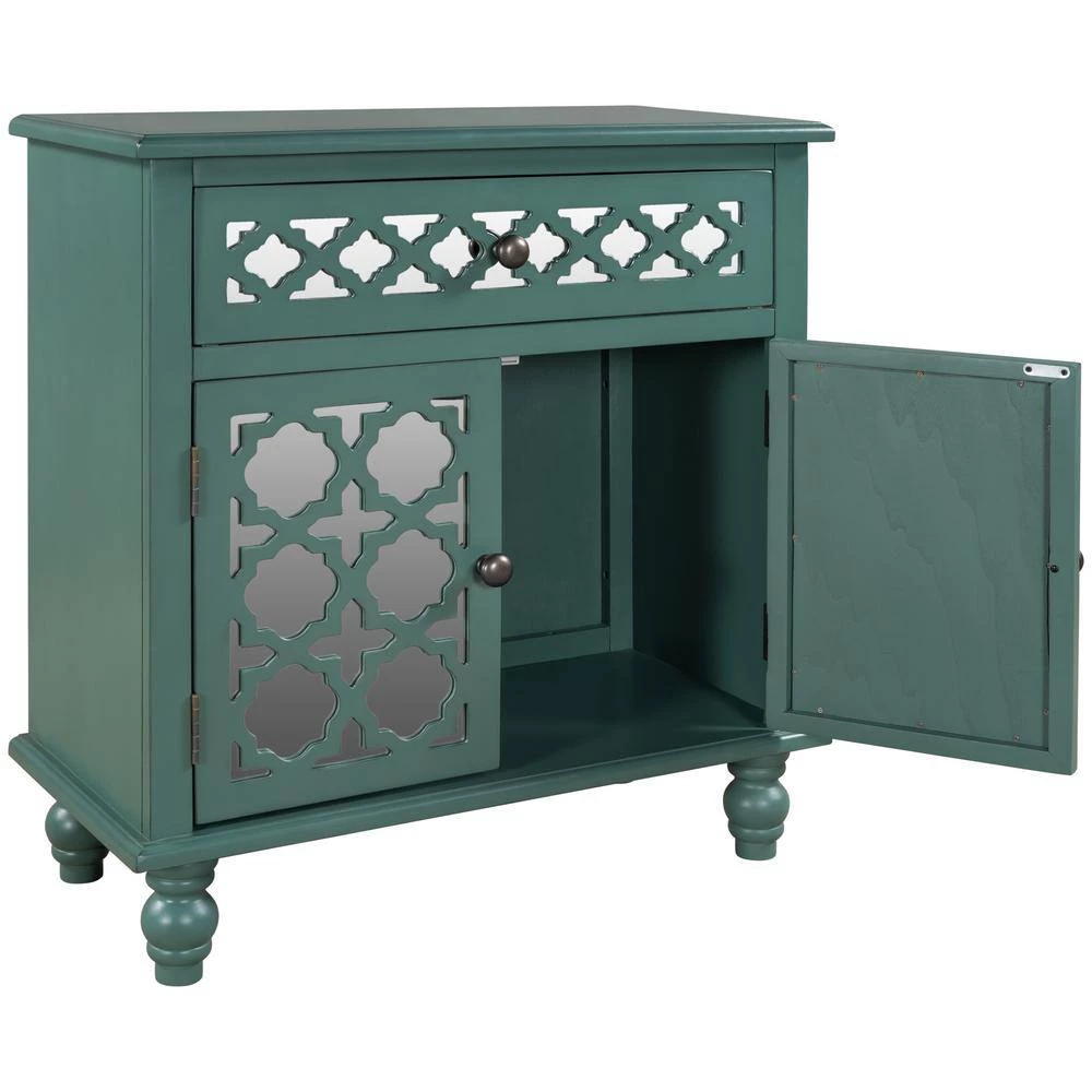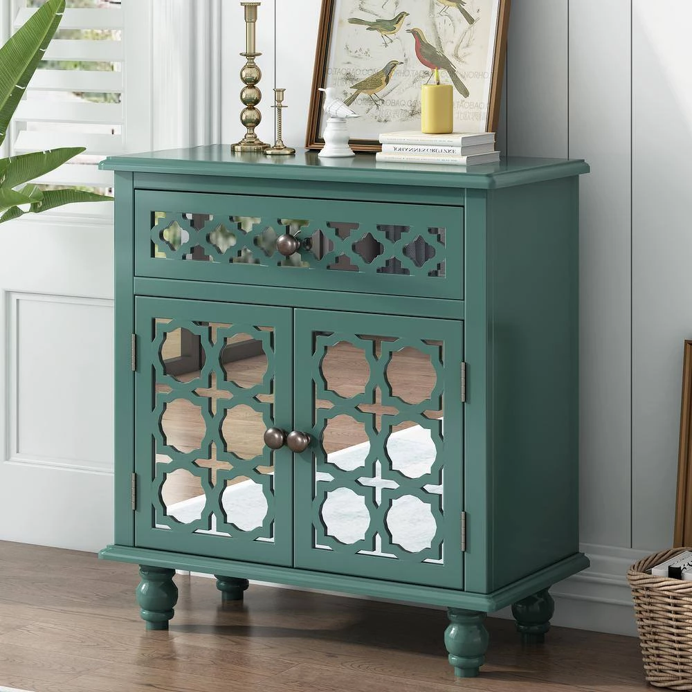 Add a touch of elegance and exquisite to your home decor with this perfect console table. Made of high quality MDF Veneer and Acacia wood, ensuring durability, balance and large load capacity. Featuring 2-mirrored doors and 1-mirrored drawer inset with an intricately-cut quatrefoil lattice, this stunning wooden cabinet with a very spacious space inside, providing you with sufficient space for blankets, board games, books and the gloss finish will create a glamorous look in your home.