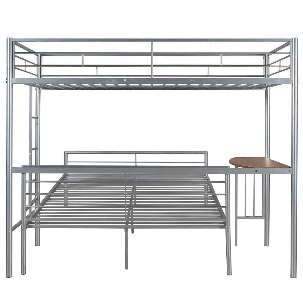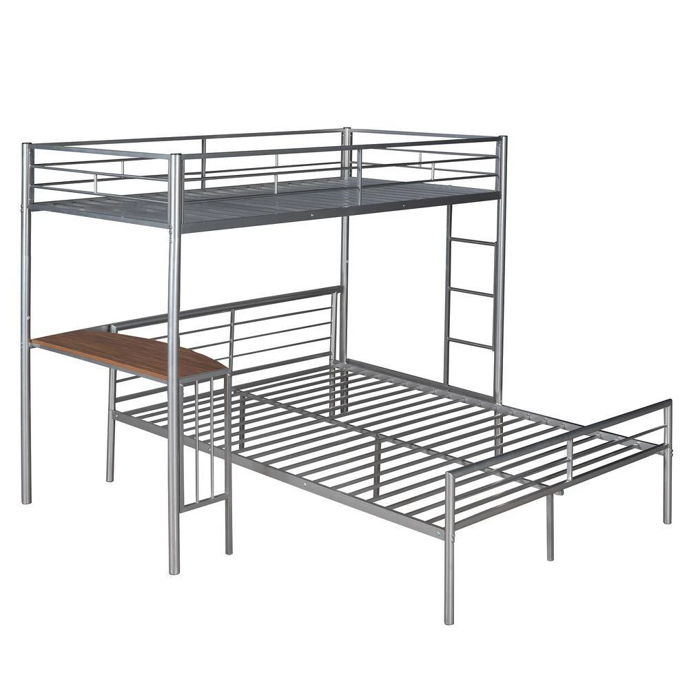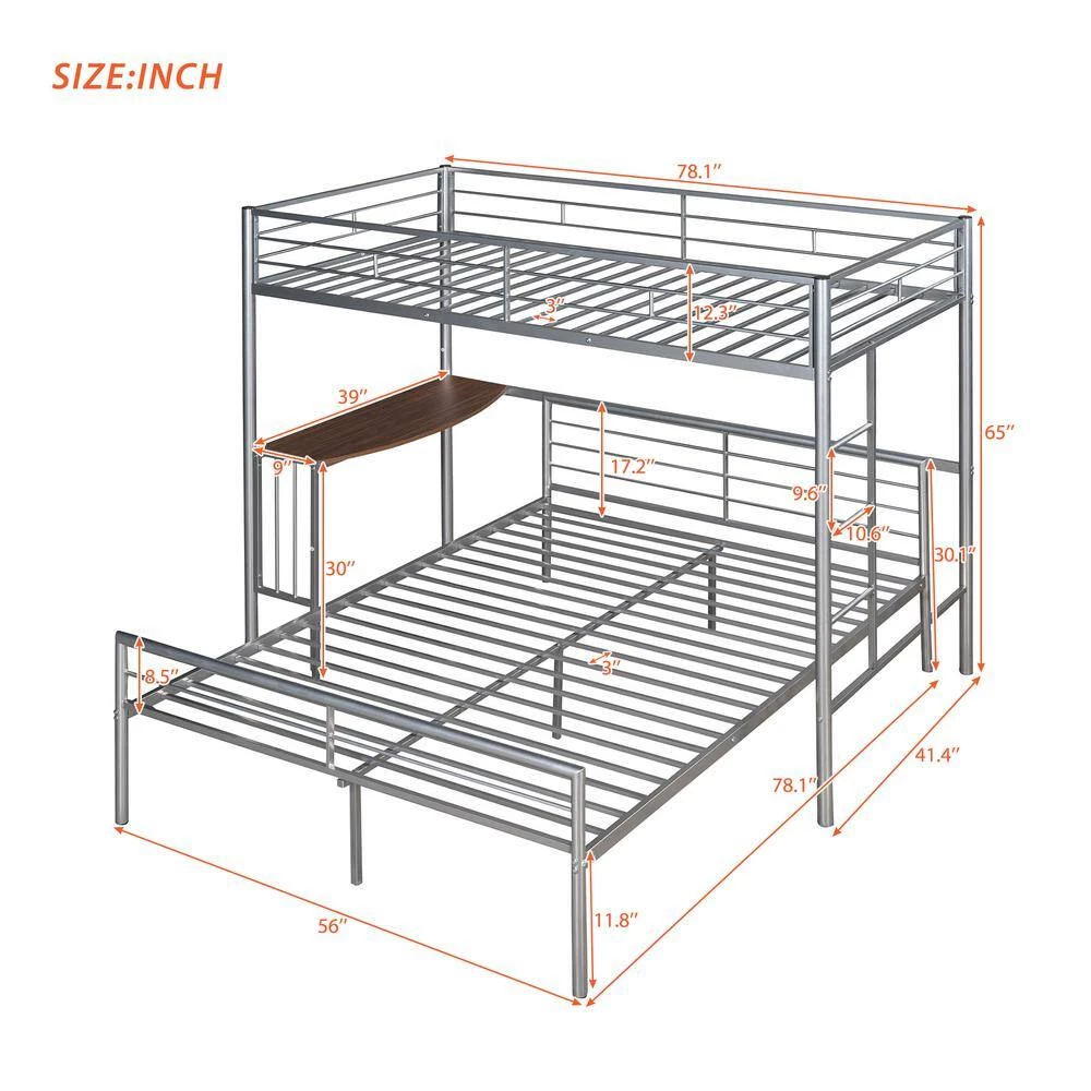 Appealing to this eye, this multi-directional bunk bed is equipped with all of the basics needed to provide a comfortable and fully functional bedroom.that will turn your sleeping quarters into an oasis. Crafted with a finished metal frame, the neutral color scheme will seamlessly play in the background of any beding and decor.styles of your choice. Featuring an expansive full sized bed.on the bottom and twin sized bed.on top facing different directions, this bunk has been for.ulated to draw the eye and make a bold contemporary statement while also accommodating multiple people. Guardrails on the upper bunk and the secure heavy duty bed.frame make this bunk a sturdy and safe option for.your bedroom. while also featuring a built-in side desk featuring MDF wood accents, making this piece a 2-in-one furniture addition to your space,