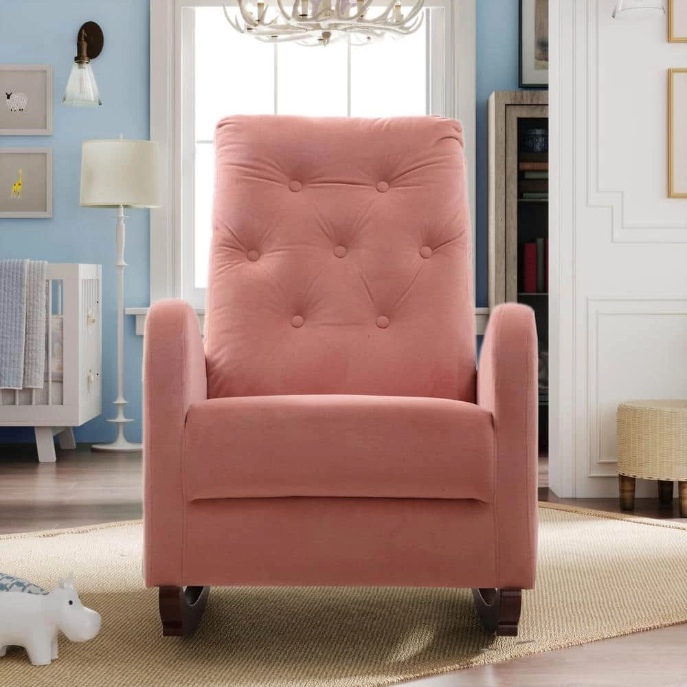 This rocking chair is the ultimate modern design piece for your home. It has a small footprint, yet there is no compromise on comfort. With its gentle rock and supportive back, its therapeutic value is irreplaceable. Upholstered in a velvet fabric, this product is designed to be a timeless addition to any room in your house or apartment.