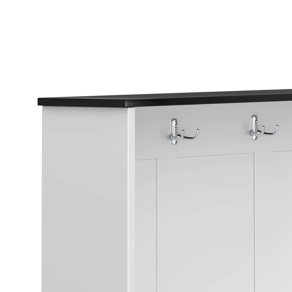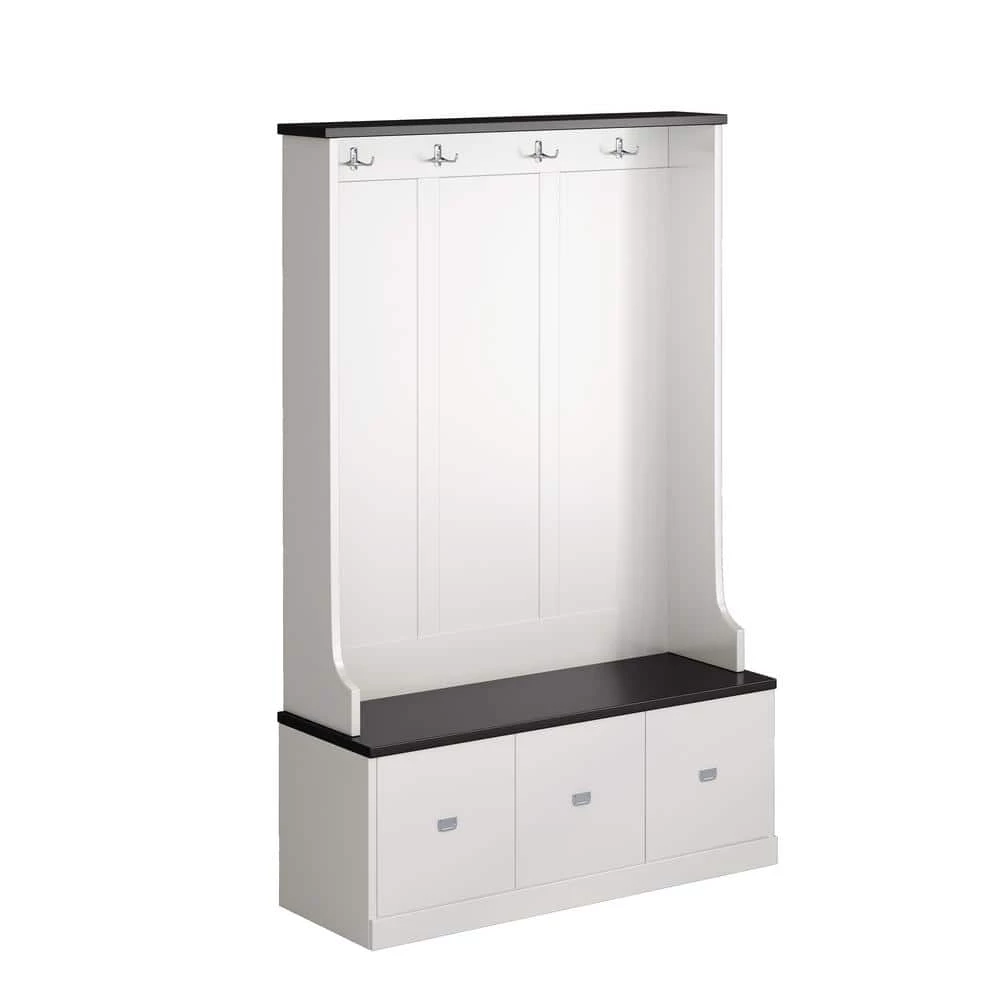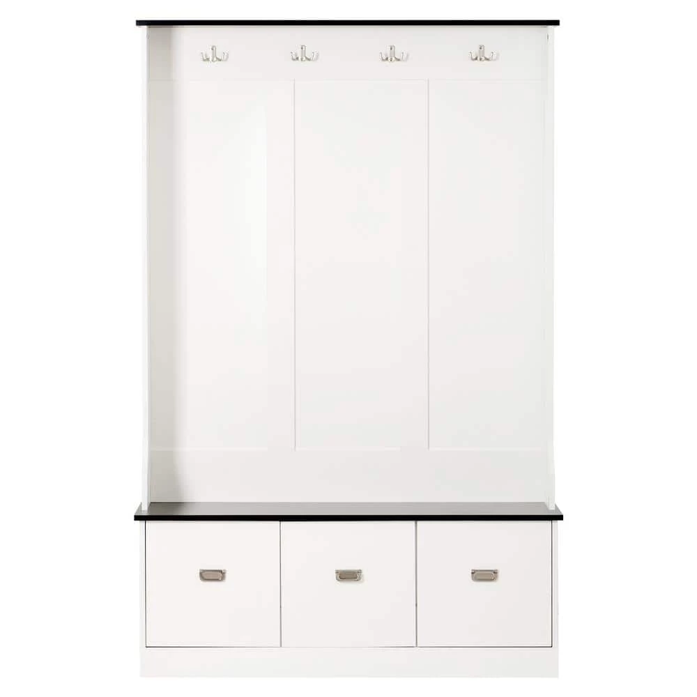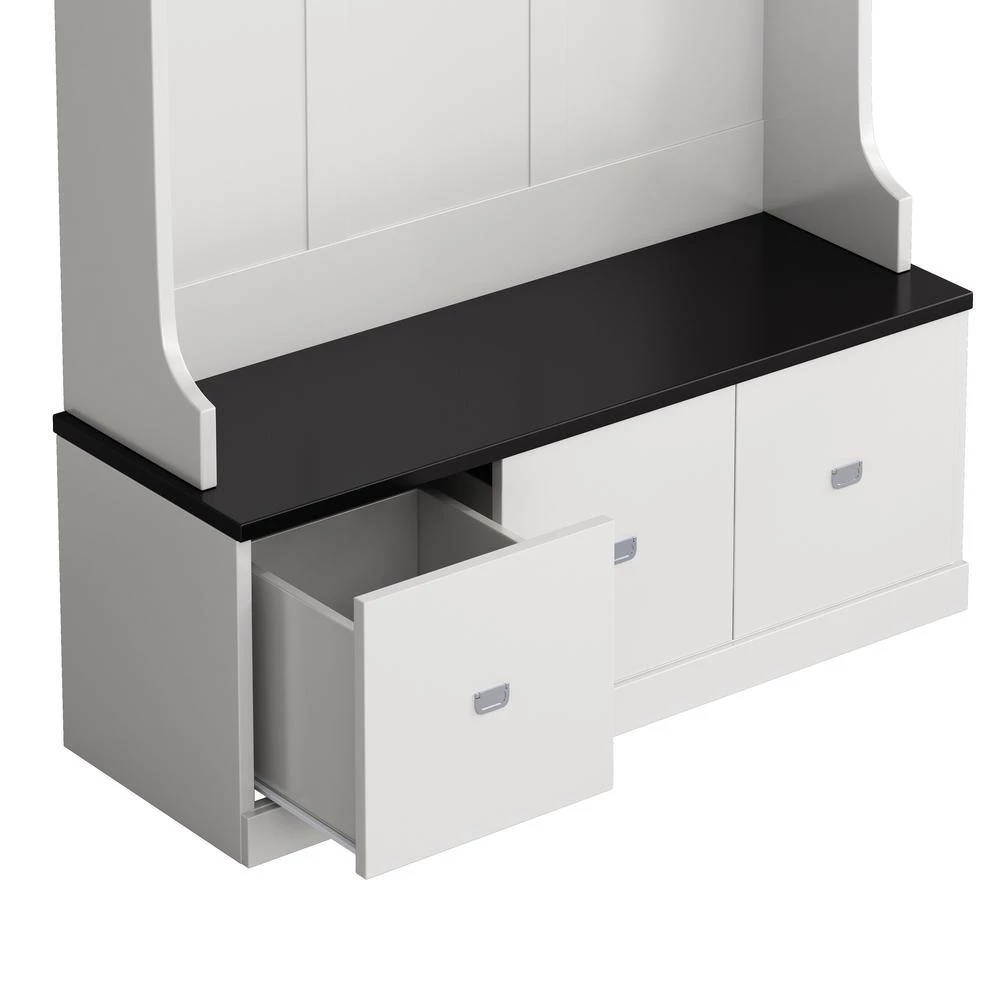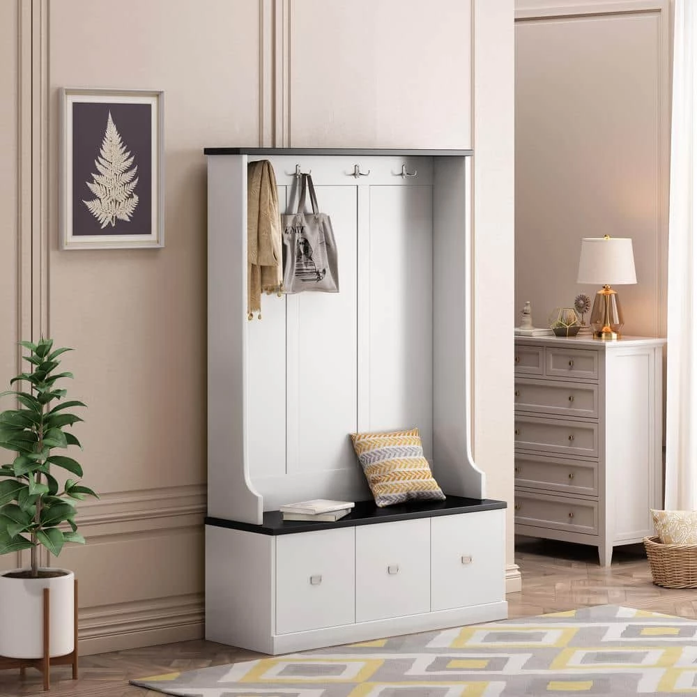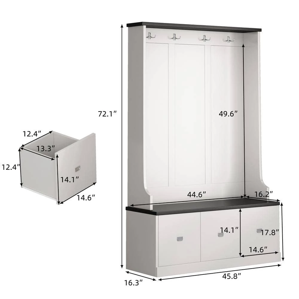 This 3-in-1 Design Hall Tree with 4 Hooks and 3 Large Drawers, It’s made from Melamine Veneered Particleboard. Keep your home’s entryway tidy and organized with this classic hall tree.4-hooks provide a spot to hang coats and hats, while the bench seat offers a spot to keep bags. The 3-drawers on the bottom offers more storage space.